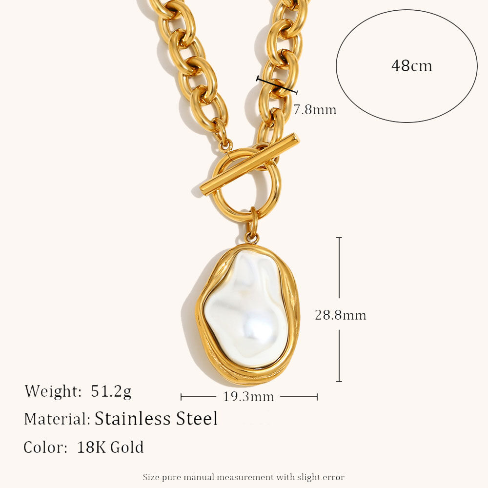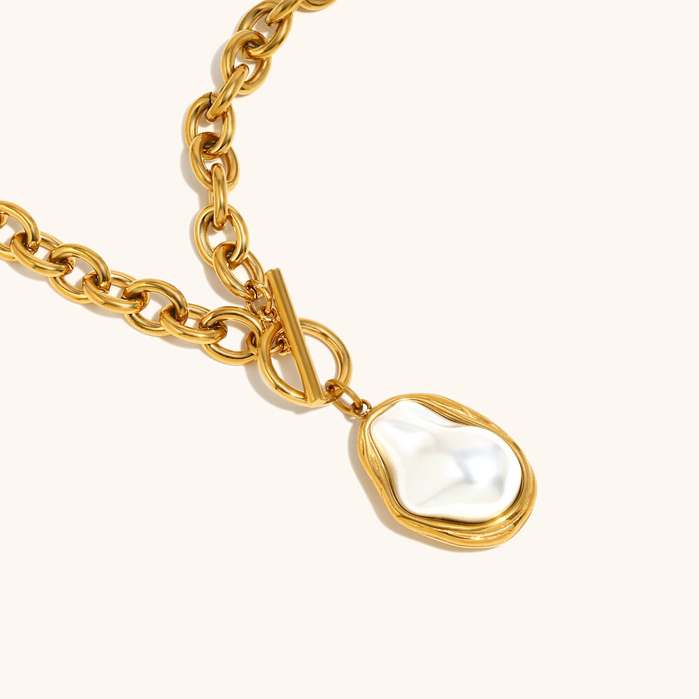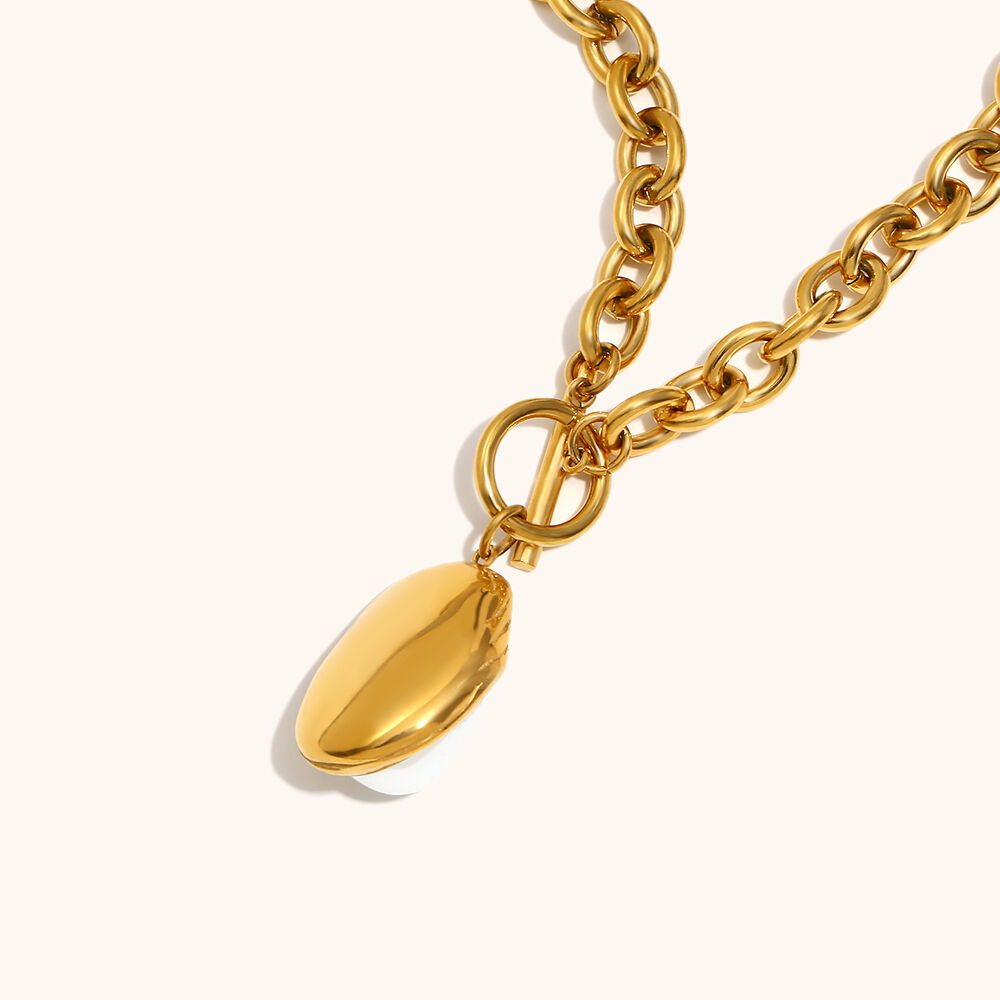 The versatility of the cable chain design allows for a broad range of merchandising opportunities. Its substantial link size makes it a perfect standalone statement piece, yet it remains clean enough to be layered with more delicate gold chains or symbolic medallions from our wider collection. This "Mix-and-Match" potential is a key driver for increasing the average order value (AOV) in a retail setting. The pearl itself is encased in a protective, textured gold-tone "Molten Metal" frame, which not only enhances the organic aesthetic but also provides a layer of physical protection for the pearl's surface, ensuring the centerpiece remains flawless through years of wear.
